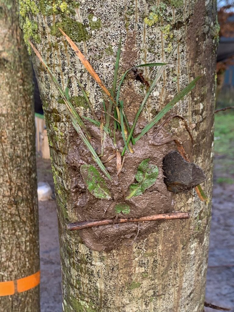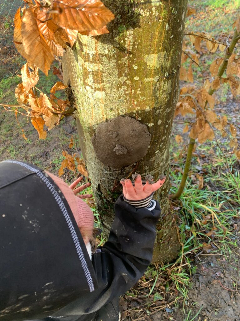 Activité : création de visages de boue. Les enfants ont été invités à modeler la boue, l’étaler en forme ovale sur le tronc d’un arbre puis décorer cette forme avec des éléments de la nature, cailloux, feuilles, brindilles, etc., afin que cela représente un visage.