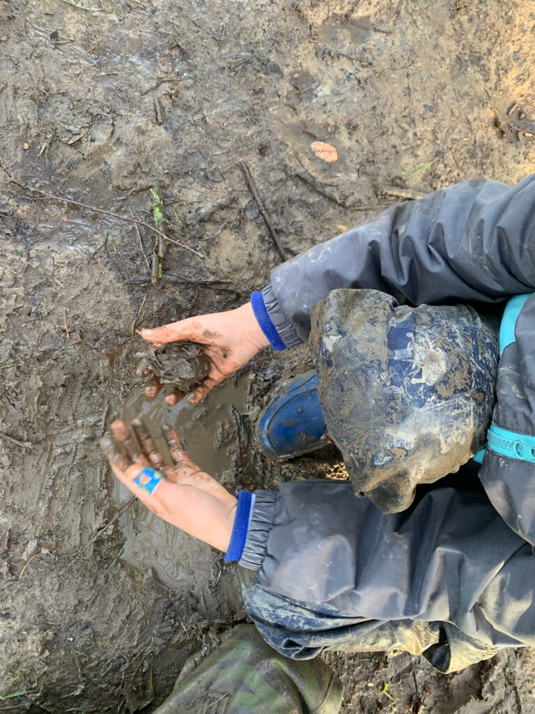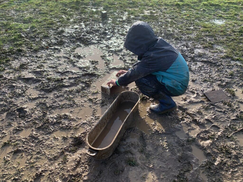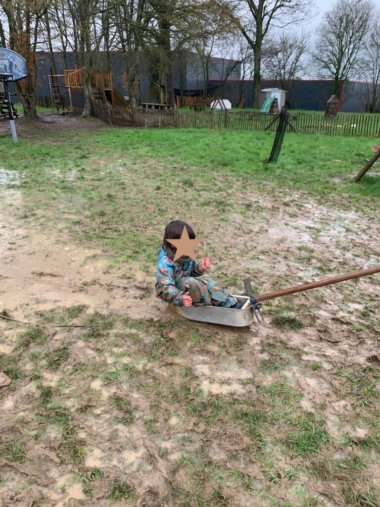 Avec toute la pluie, le jardin est devenu boueux. Bien équipé, cela devient une aire de jeu riche de découvertes !